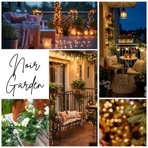 Orta büyüklükte balkon ve teraslar için kurgulanan bu Noir Garden paket; koyu yeşiller ve yumuşak aydınlatmalarla geceye uyumlu, sakin bir atmosfer sunar. Yasemin ve gardenya gibi gece kokan çiçekler, koyu yapraklı bitkilerle birleşerek duyulara hitap eden huzurlu bir ortam oluşturur. Alanın büyüklüğüne göre kullanılacak oturma öğeleri ve koltuklar; siyah seramik saksılar, ışık zincirleri, led spotlar ve solar fenerlerle tamamlanarak dengeli bir gece deneyimi yaratır.